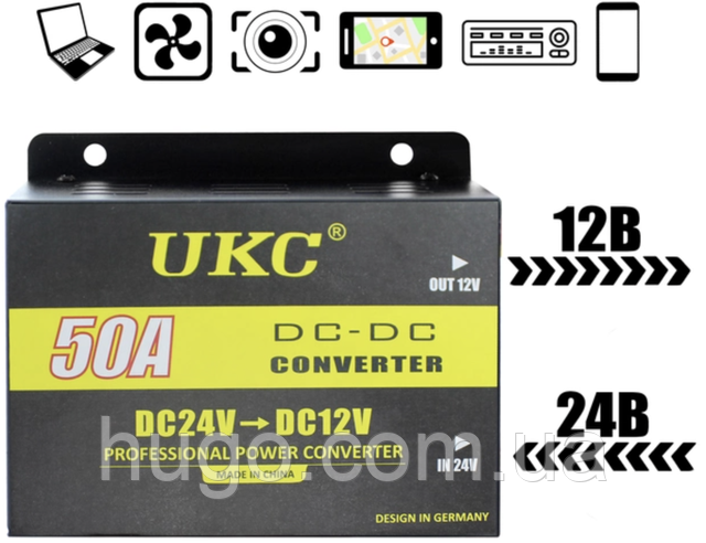 Перетворювач DC/DC 24v-12v 50A призначений для перетворення електрики з 24 В на 12 В. Дає змогу під'єднувати навантаження до 120 Вт. Наприклад: відеокамеру, телефон, ноутбук, різну аудіо- та відеотехніку та інші електроприлади.