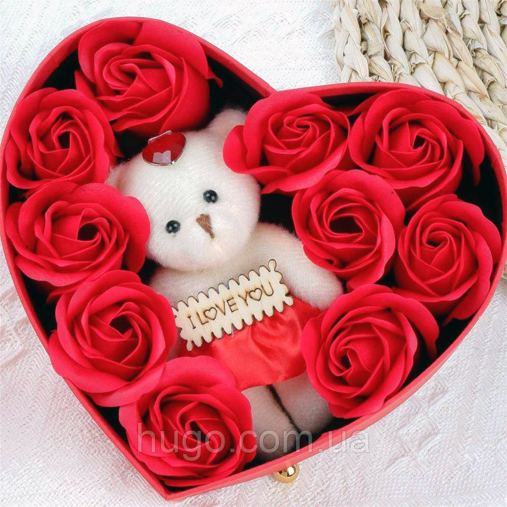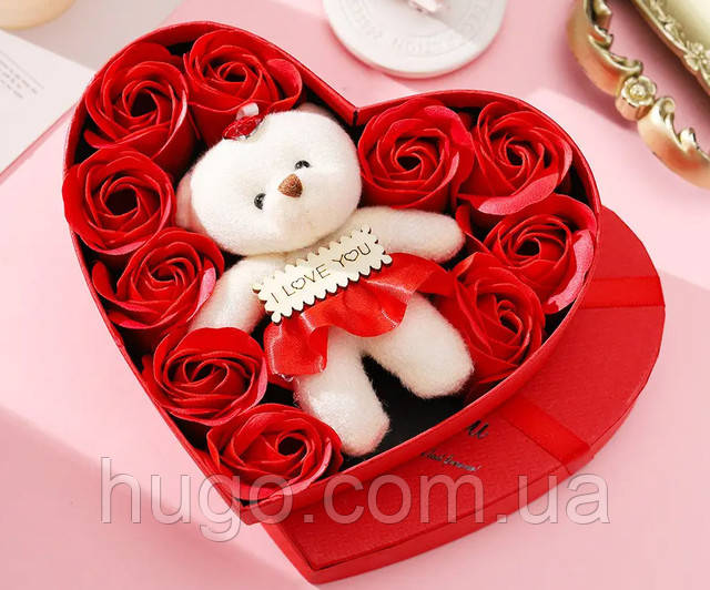 -30%Подарунковий набір "Ведмедик з мильними трояндами" у формі серця / Мильні троянди в коробці / Троянди з мила